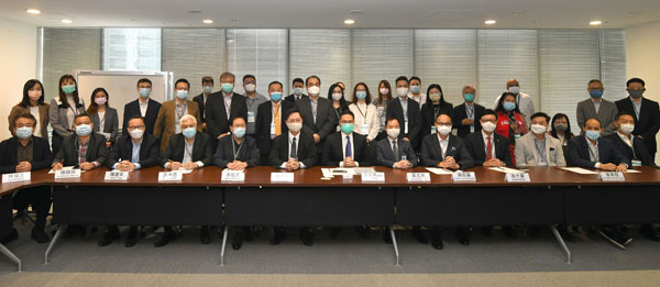 創新及科技局局長薛永恒(前排左六)今日(13日)向批發及零售界代表介紹「安心出行」流動應用程式,並與副政府資訊科技總監黃志光(前排右五)、立法會議員邵家輝(前排右六)和一眾批發及零售界代表合照。