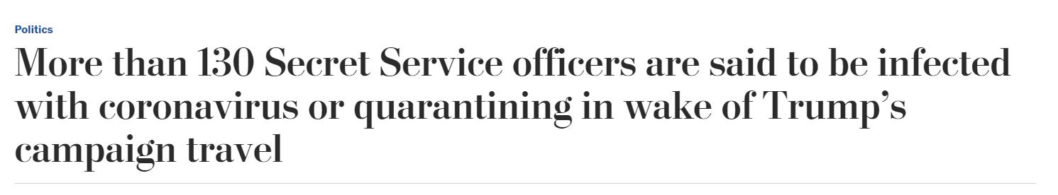 報道指,這些特工是在特朗普的競選集會上或在白宮執勤時被感染,而被隔離的特工佔到該機構核心團隊的10%(特勤局約有1300名工作人員,以守衛白宮和副總統官邸)。報道稱,如此高的感染率據信與特朗普在大選前舉行的眾多競選集會有關——僅在競選活動的最後三天就有14場集會。在這些集會上,特工們站在總統和他的支持者之間,他們中的許多人沒有戴面具,也沒有遵守社交距離。