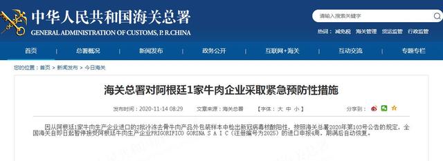 據通報,因從阿根廷一家牛肉生產企業進口的2批冷凍去骨牛肉產品外包裝樣本中檢出新冠病毒核酸陽性,按照海關總署2020年第103號公告的規定,全國海關自即日起暫停接受阿根廷牛肉生產企業FRIGORIFICO GORINA S A I C(註冊編號為2025)的進口申報4周,期滿後自動恢復。