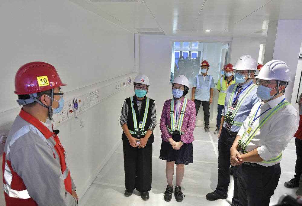 圖為發展局局長黃偉綸、食物及衞生局局長陳肇始和建築署署長林余家慧到臨時醫院內其中一個病房參觀。