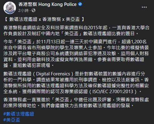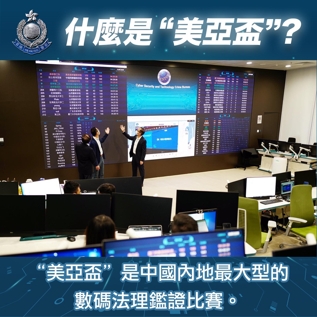 今年的「美亞盃」數碼法理鑑證比賽於11月13日起一連3日在廈門舉行,比賽有超過1200名來自中國各省市刑偵學院的學生及專業人士參加。警方在社交平台表示,網絡安全及科技罪案調查科由2015年起便與香港大學合作去設計和制訂「美亞盃」的比賽題目。