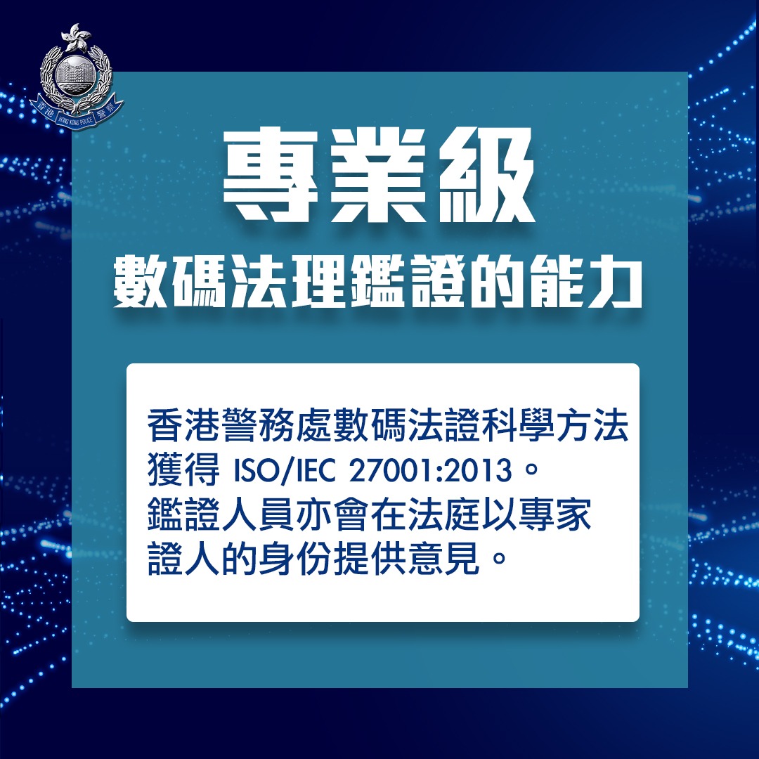 警方亦介紹數碼法理鑑證的定義,並表示數碼法理鑑證的調查結果會常被應用於刑事調查、檢控及法庭審訊。警方同時認為自己能一直被獲遨為「美亞盃」擔任出題和評審是反映警方在業界的領導地位,而它們會繼續致力推動數碼法理鑑證的發展。