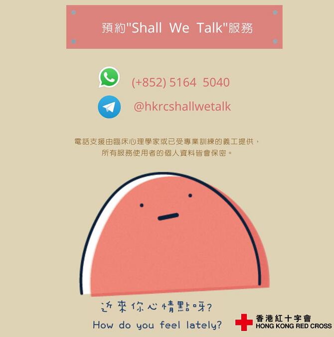 香港紅十字會指,將會提供心理支援服務「Shall We Talk」,任何有需要的市民可於辦公時間(星期一至五的上午10時至下午6時)直接致電或WhatsApp至5164 6070、Telegram @hkrcshallwetalk預約心理支援服務。香港紅十字會表示,心理支援服務是由臨床心理學家及已受訓的心理支援服務義工提供,而所有個人資料及內容均會保密。(記者唐信恒)
