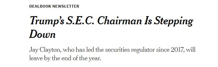 據美國《紐約時報》最新消息,自2017年以來一直擔任美國證券交易委員會主席傑伊•克萊頓(Jay Clayton)將於今年年底離任。