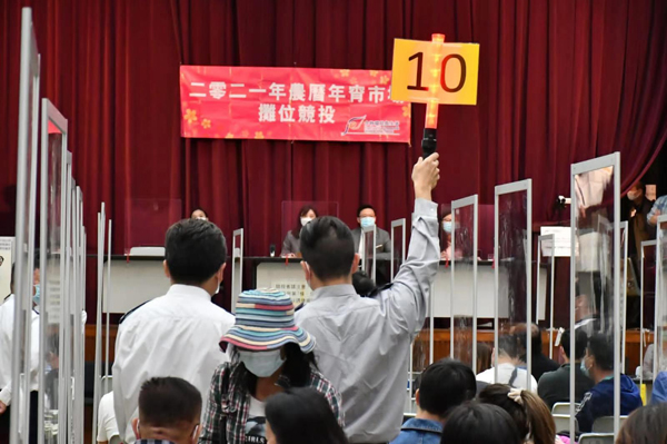 全港15個農曆年宵市場將於明年2月6日至12日舉行,合共1021個濕貨攤位由今日起公開競投。而受到新冠肺炎疫情影響,明年年宵場內將不設乾貨及快餐攤位。其中維園年宵市場共設175個攤位,底價5440元,今早競投情況比往年冷淡,有14個檔位因無人競投而需收回,亦有35個檔位只需底價5440元便可成交。而今早的「檔王」成交價為1萬元,位於近天后興發街的58號檔位。