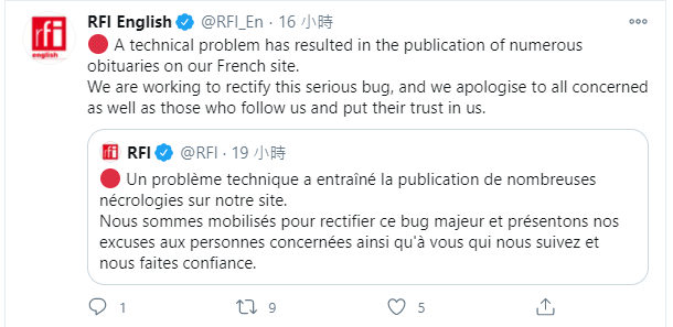 RFI在聲明中表示,誤報是因為出現技術問題,已經調派人手糾正錯誤,又向信賴公司的群眾和受影響人士致歉。RFI的法國網站日前公布近100名因新冠肺炎而離世的名人及公眾人物,但名單卻赫然寫上不少還在生的人物,例如伊朗最高精神領袖哈梅內伊、美國前總統卡特等。