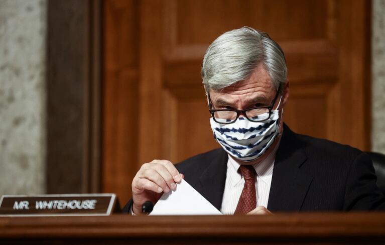 參議員謝爾頓·懷特豪斯在參議院司法委員會聽證會上聽取了Facebook和Twitter圍繞競爭激烈的選舉的行動。美聯社