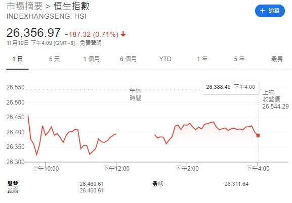 19日,恒指表現低迷,收報26356點,跌187點或0.71%,大市成交額1319.37億元。國指跌0.8%報10555點,恆生科技指數跌0.86%。