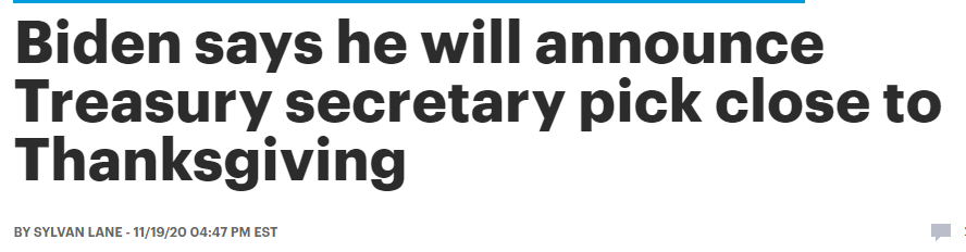 據《國會山報》消息,拜登當天在新聞發布會上說,他選擇的「是一位我認為將被民主黨各派所接受的人選......不管是進步派還是溫和派。」他說他將在感恩節(11月26日)之前或之後宣布這一消息。報道中還提到,拜登尚未宣布任何內閣提名,而進步派人士一直密切關注其在財政部官員人選上的選擇。