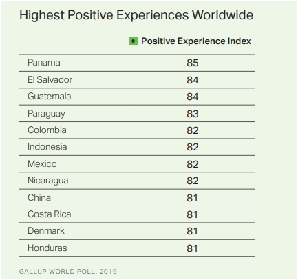 相反,哪些國家的積極情緒指數最高?調查顯示,2019年,以巴拿馬為首的一些拉丁美洲國家積極情緒指數最高,均在80以上。除拉丁美洲這些國家以外,積極情緒指數最高的國家還有印度尼西亞、中國和丹麥。在蓋洛普「全球情緒最積極國家」的排行榜上,中國以積極情緒指數81的數據位居前10名。(圖源:蓋洛普2020年度全球情緒調查報告)