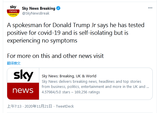 另據多家媒體21日消息稱,小特朗普的發言人證實,其新冠檢測結果呈陽性,且目前正在進行自我隔離,不過尚未出現症狀。