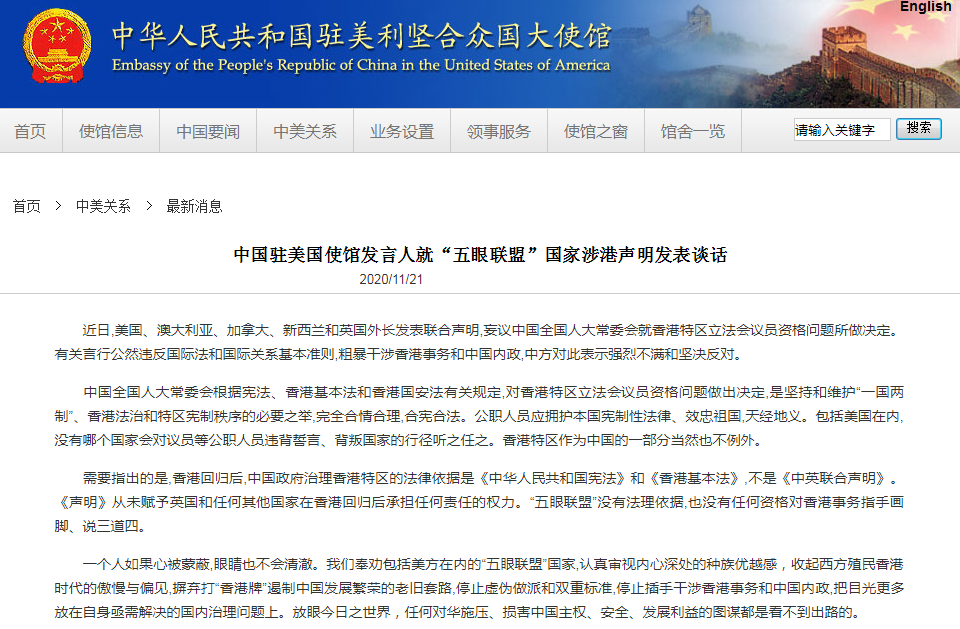 需要指出的是,香港回歸後,中國政府治理香港特區的法律依據是《中華人民共和國憲法》和《香港基本法》,不是《中英聯合聲明》。《聲明》從未賦予英國和任何其他國家在香港回歸後承擔任何責任的權力。「五眼聯盟」沒有法理依據,也沒有任何資格對香港事務指手畫腳、說三道四。