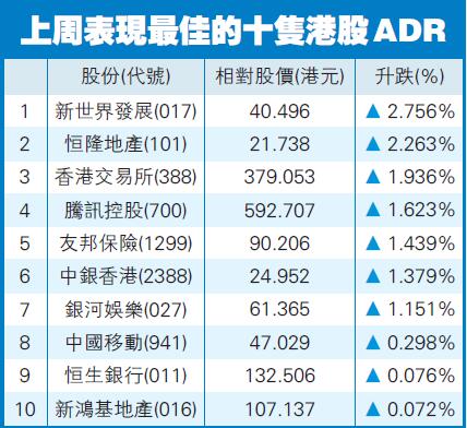 美國財政部與聯儲局紓困方案分歧加重了市場壓力,美國股市上周五普遍受壓,惟港股ADR上周五升逾百點,騰訊(700)ADR折合報592.26元,較本港收市升0.72%,匯控(005)ADR亦升0.72%。