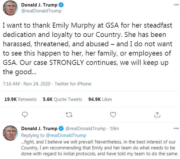 但他在推文中首度松口称:「为了我们国家的最大利益,我建议艾米丽和她的团队在初始過渡進程方面做需要做的事情,并且已经告诉我的团队也这样做」。