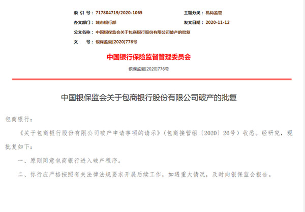 銀保監會表示,《關於包商銀行股份有限公司破產申請事項的請示》(包商接管組〔2020〕26號)收悉。經研究,現批覆如下:一、原則同意包商銀行進入破產程序;二、銀行應嚴格按照有關法律法規要求開展後續工作,如遇重大情況,及時向銀保監會報告。