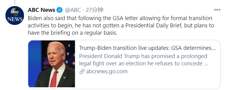 據美國廣播公司(ABC)剛剛消息,美國國家情報主任辦公室(ODNI)稱,白宮批准向「當選總統」拜登的團隊提供總統每日簡報,「作為支持過渡的一部分」。