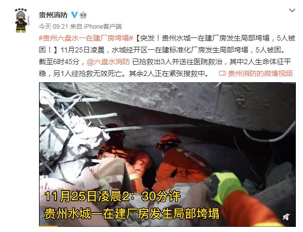 據貴州消防官方微博發布消息,11月25日淩晨2時30分許,貴州省六盤水市水城經開區一在建標準化廠房發生局部垮塌,造成5人被困。