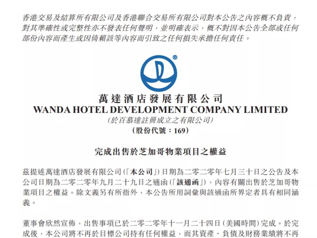 11月25日晚間,萬達酒店發展(00169.HK)公告,美國時間11月24日,公司完成出售芝加哥物業項目。公司將不再持有目標公司任何權益,目標公司的資產、負債及財務業績將不再綜合計入公司的綜合財務報表。至此,萬達集團已將其海外地產項目全部清空。
