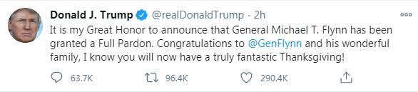 美國總統特朗普在當地時間25日發布推特確認,已特赦牽涉「通俄門」的前國家安全顧問弗林,並恭賀弗林及家人可以過一個美妙的感恩節。 弗林是首位因俄羅斯涉嫌干預美國大選而被美國情報機關調查的政府官員,並在上任不到一個月更辭職,成為美國歷史上任期最短的國安顧問 。