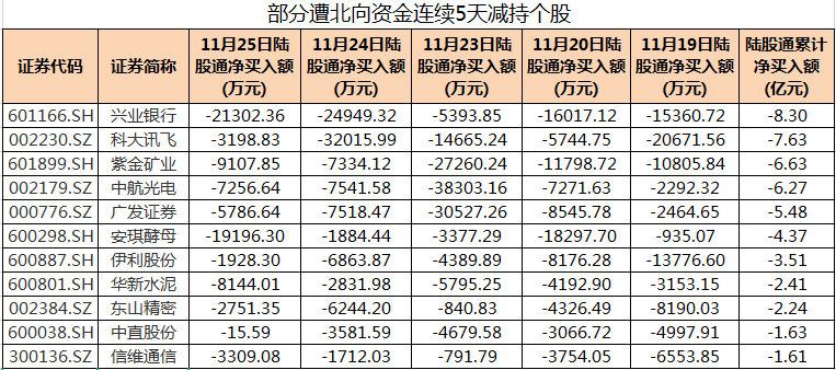據同花順iFinD統計,近5個交易日(11月19日-11月25日)55股遭北向資金連續5天淨賣出。遭北向資金連續減持前5名的個股分別是興業銀行、科大訊飛、紫金礦業、中航光電、廣發證券。5天累計淨賣出金額在5000萬元以上的有26隻,其中16隻累計淨賣出額超億元。興業銀行遭北向資金5天累計淨賣出約8.3億元,北向資金最新持有約5.48億股,位居連續減倉榜首。