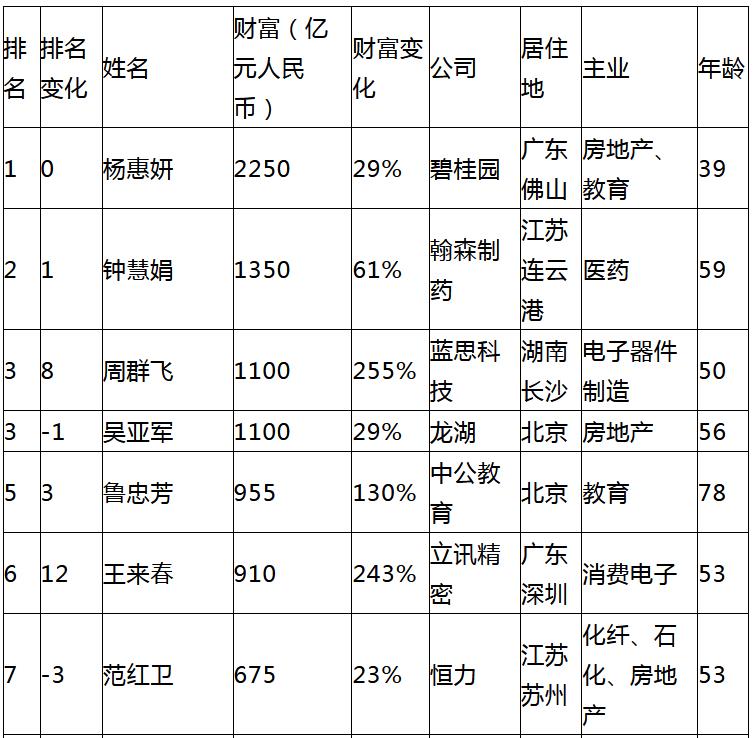 「醫藥女王」59歲連雲港人鍾慧娟財富增長510億達1350億,超過「地產女王」吳亞軍首次成為中國及全球白手起家女首富。螞蟻集團49歲的彭蕾是白手起家上榜新人中排名最靠前的,以305億位列第19名,彭蕾參與創造了2個萬億級企業:阿里巴巴和螞蟻集團。