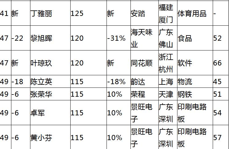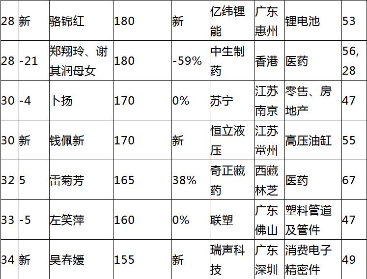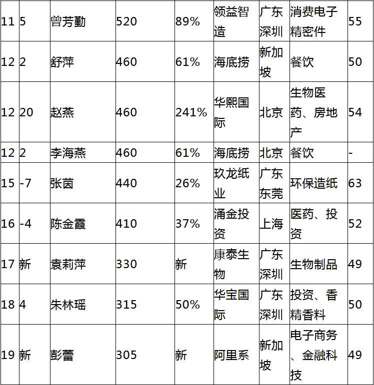 此次共有13位女企業家落榜,分別是因債務違約導致財務危機的新華聯肖文慧;因財富沒有達到115億門檻而未上榜的波司登梅冬、恒瑞的吳羽嵐、茂業的張靜、雅居樂的陸倩芳、敏華的許慧卿、金典的王秋楊、海瀾之家的周晏齊、南都的趙亦斕、聖農的傅芬芳、申通的陳小英、永鋒的林旭燕和陌陌的張思川。