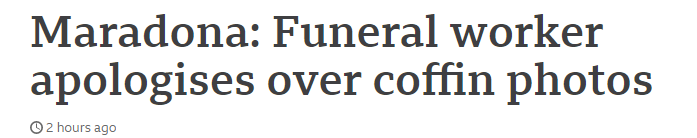 日前,阿根廷幾名工作人員與馬勒當拿遺體合影「自拍」的照片在社交網絡上流傳開來,引發大批網友斥責。當地時間27日,照片中出現的其中一名殯葬工克勞迪奧·費爾南德斯為此事致歉,請求人們的原諒,並稱自己曾和馬勒當拿很親近,並沒有不尊重這位球星。