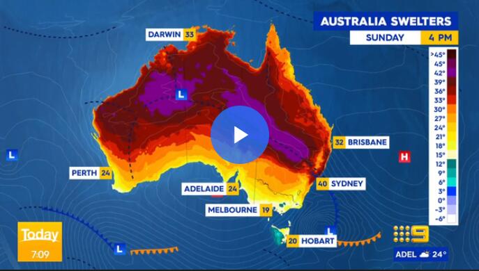澳洲東南部和東部受熱浪侵襲,多處地區星期六晚的氣溫創下新高,氣溫再次超過40℃,本周末的高溫有可能打破80年來該州夏季外最熱的紀錄,這也將成為澳大利亞有紀錄以來最熱的11月。其中悉尼昨晚氣溫高達攝氏40度,新南威爾士州、維多利亞州及南澳洲部分地方,高溫更達攝氏45度。當局預料,高溫天氣會在今個星期持續,呼籲民眾要小心火種,避免發生山火。