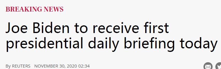 據路透社11月30日消息, 根據拜登過渡團隊的電子郵件聲明,美國當選總統拜登將在當地時間周一(30日)接受總統每日簡報。報道稱,拜登將在簡報會後與過渡期顧問會面。