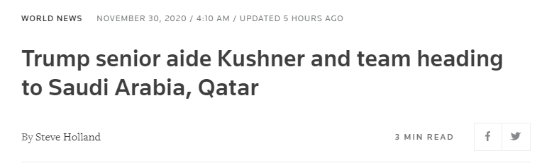 庫什納之行是在周五德黑蘭的法克里紮德被不明身份的襲擊者殺害之後發生的。一名以色列官員說,事發前幾天,以色列總理內塔尼亞胡曾前往沙特,並和本·薩勒曼和美國國務卿蓬佩奧舉行了會晤。