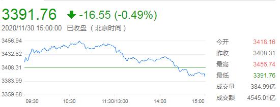 11月30日,星期一,農曆十月十六。今日早盤A股三大股指集體高開,高開後出現分化,開盤後滬指在金融股、周期股的共同推動下漲超1%,逼近前高3458點,上證50一度大漲2%。深成指、創業板指盤初快速下探後逐步回升。10點40分後,滬指出現一波小幅調整,深成指、創業板指趁勢走高,創業板指漲幅超過1%,午前三大股指集體走高。盤面上,券商、銀行等權重板塊延續強勢,煤炭等順周期板塊逐步走強。市場成交量顯著放大,個股漲多跌少,賺錢效應較好。午後,滬指漲幅快速收窄,創指延續盤整態勢。金融股持續調整,可降解概念成市場唯一熱點。尾盤,滬指下挫失守3400點位,此前一度漲1.4%。盤面上,券商股漲幅大幅收窄,金融股漲勢整體回調。總體上,資金情緒持續走弱,賺錢效應轉差。