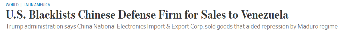 據美媒消息,當地時間30日,美國對中國電子進出口有限公司(CEIEC)實施制裁,指責該公司支持委內瑞拉總統尼古拉·馬杜羅(Nicolas Maduro)政權破壞民主的努力,並宣稱像CEIEC這樣的中企協助了馬杜羅政府對網絡活動實施監控。 這些指責全然不顧馬杜羅政府是委內瑞拉合法政府的事實。