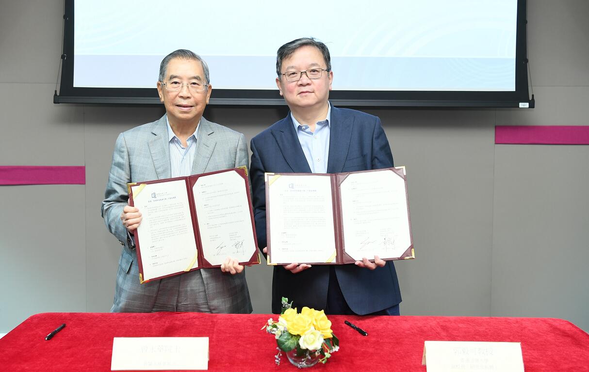 曾肇添慈善基金成員曾永華及浸會大學副校長(研究及拓展)郭毅可分別代表曾肇添慈善基金及浸會大學簽署捐款協議書。