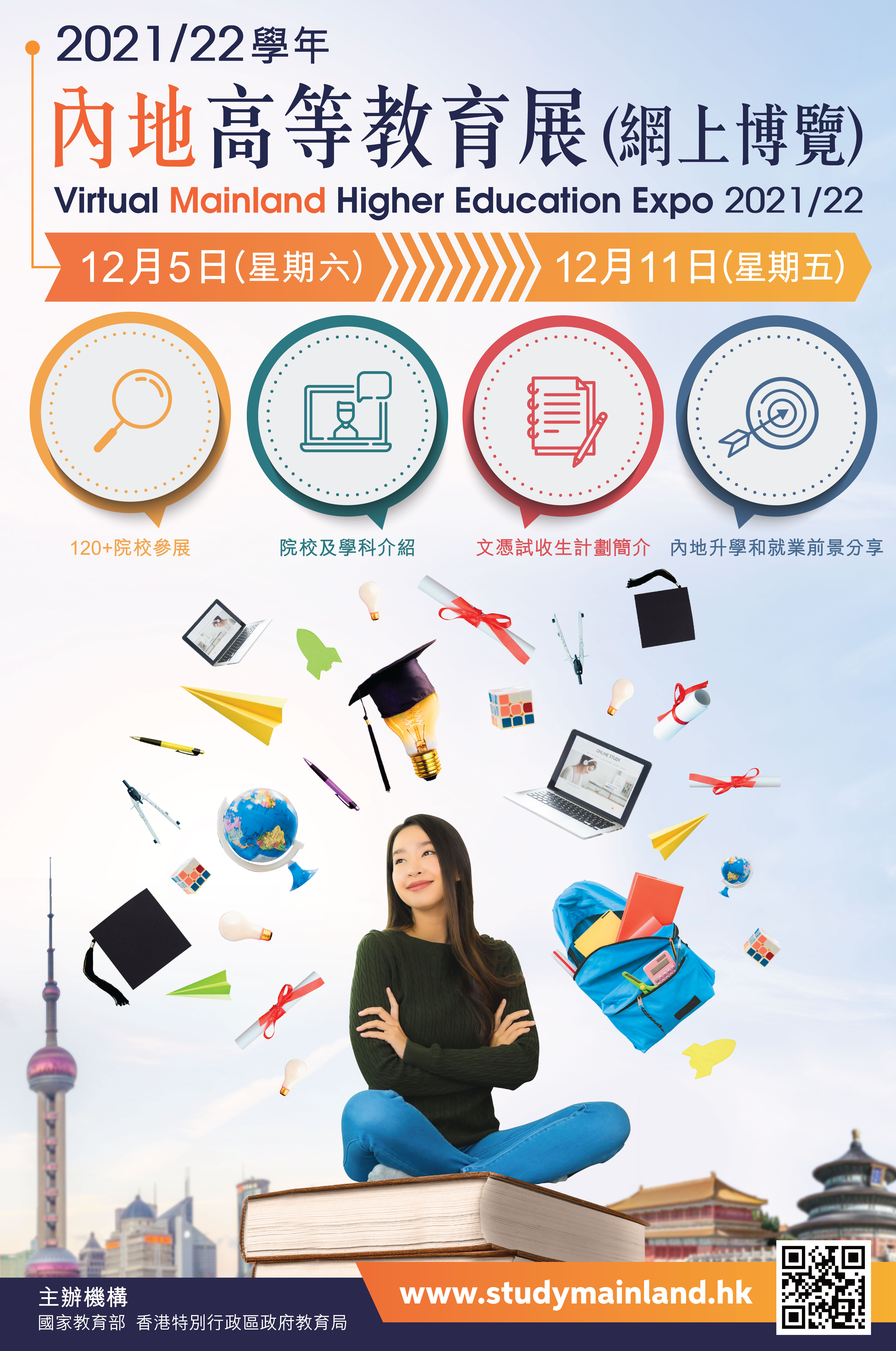 教育局指與國家教育部合辨的2021/22學年內地高等教育展(網上博覽)將於12月5至11日在網上平台(www.studymainland.hk)舉行。