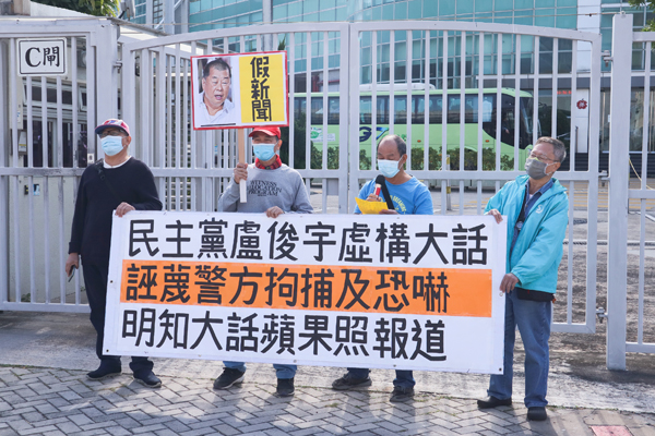 數名市民則到將軍澳蘋果日報大樓外抗議,要求蘋果日報就屯門民主黨區議員盧俊宇虛假指控警方一事作失實報道公開道歉。市民指,盧俊宇在11月21日晚於社交平台發帖文,訛稱自己於元朗被警方拘捕及恐嚇,事後證實為虛假事件,盧涉嫌浪費警力罪名被捕。早於盧俊宇當晚發出虛假消息後,蘋果日報迅即報道及廣傳相關新聞,再次證明蘋果日報一貫作風是做假新聞。