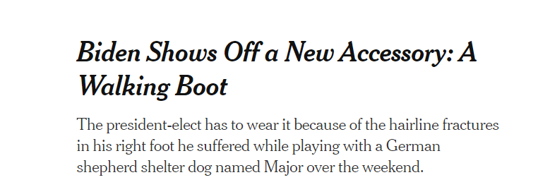 據此前報道,拜登辦公室於11月29日發表聲明稱,拜登在與寵物狗玩耍時扭傷了腳踝。29日晚些時候,醫生表示,拜登的腳部輕微骨裂。