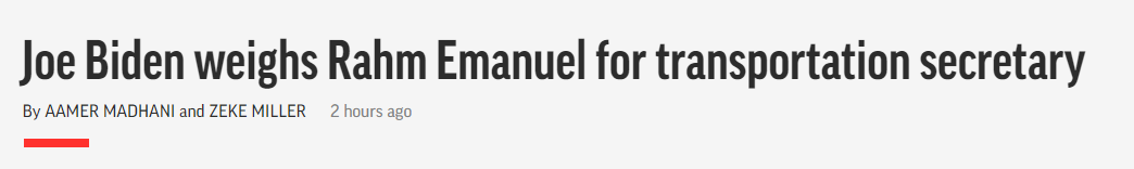 另外,据美聯社引述知情人士消息,前芝加哥市市長拉姆·伊曼紐爾(Rahm Emanuel)是拜登目前考慮的交通部長人選之一。但包括紐約州聯邦眾議員柯提茲(Alexandria Ocasio-Cortez)在內的民主党進步派領導人士,都對伊曼紐可能加入内阁的前景做出批評。