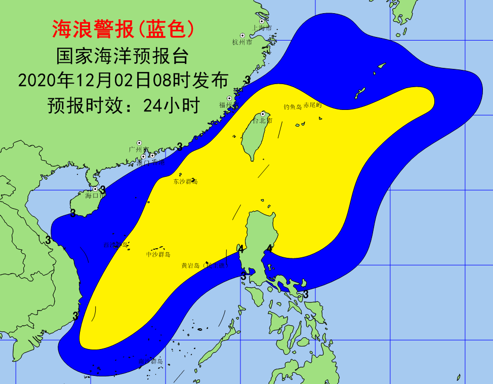 受冷空氣的影響,預計:12月2日中午到3日中午,東海南部、台灣海峽、南海北部、中部、巴士海峽、台灣以東洋面將出現3到5米的大浪到巨浪區;福建、海南東南部近岸海域將出現2到3米的中浪到大浪。海浪預警級別為藍色。