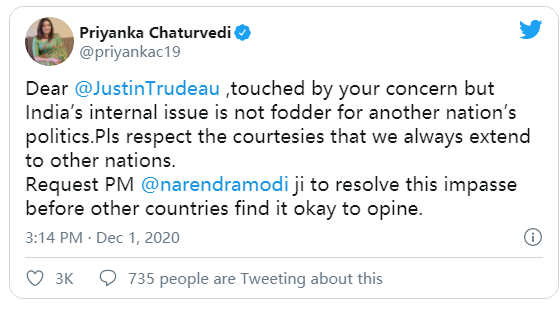 印度國會議員、右翼地區政黨的副領袖普里揚卡·查圖維迪也在推特上說,「印度的內部問題不是另一個國家政治的話題」。