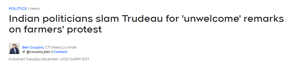 此前,加拿大新民主党領導人和不列顛哥倫比亞省總理都發表過支持印度農民的聲明,但杜魯多被認為是第一位公開發表聲明的世界領導人。