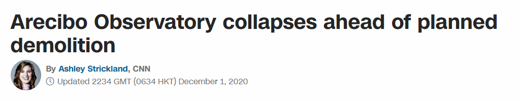 據CNN報道,當地時間1日,美國國家科學基金會稱,位於波多黎各的阿雷西博天文台的巨型射電望遠鏡平台於11月30日晚間至12月1日淩晨之間坍塌。