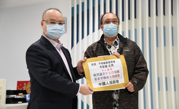 曹達明又指區議員李文浩的行為涉嫌違犯《種族歧視條例》,遂來到平等機會委員會投訴,希望平機會能秉公辦理,執行法例賦與的權力,對李文浩作出遣責及嚴懲,他們向平機會職員遞交投訴信後和平散去。(記者李銘欣 蔡啟文攝)
