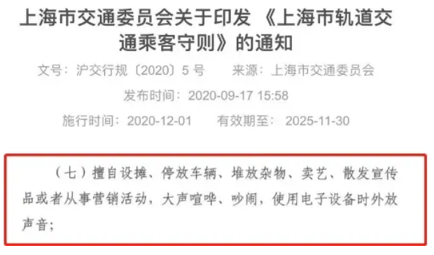 12月1日起,新修訂的《上海市軌道交通乘客守則》正式施行,其中明確禁止使用電子設備時外放聲音。