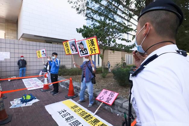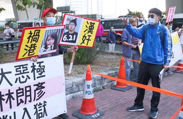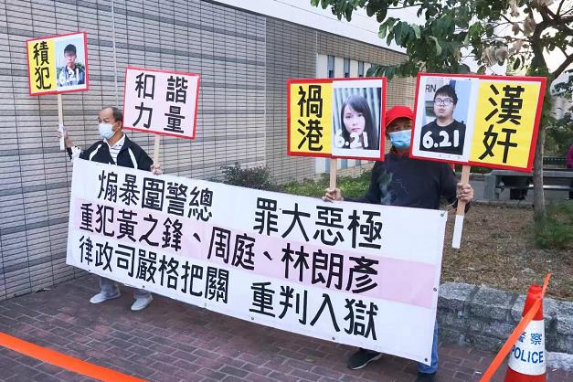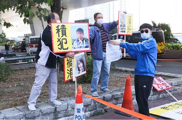 前香港眾志成員黃之鋒、周庭及林朗彥涉嫌於去年6月21日包圍灣仔警察總部,今日判決。有數名市民今午高舉橫額於西九裁判法院外請願,批評三人為積犯、禍港及漢奸,去年煽動年輕人訴諸暴力,四處宣揚「港獨」,甚至要求別國插手中國內政,要求別國制裁香港,令香港民不聊生,支持法院將三人重判, 為香港社會建立正向價值觀,希望律政司嚴格把關。(記者葉珮如 馮瀚文攝)