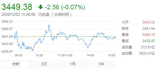 12月2日,星期三,農曆十月十八。今日三大股指衝高回落,創指一度跌1%。滬指盤中急速拉升翻紅創下3年來新高3465.73點,之後回落。盤面上,黃金等有色板塊表現活躍,半導體、光電等題材概念先後拉升,大金融則全線分化,市場總體賺錢效應不佳。資金觀望情緒漸濃。午後,指數波瀾不驚,滬指圍繞平盤線窄幅震蕩,創指跌幅有所收窄。