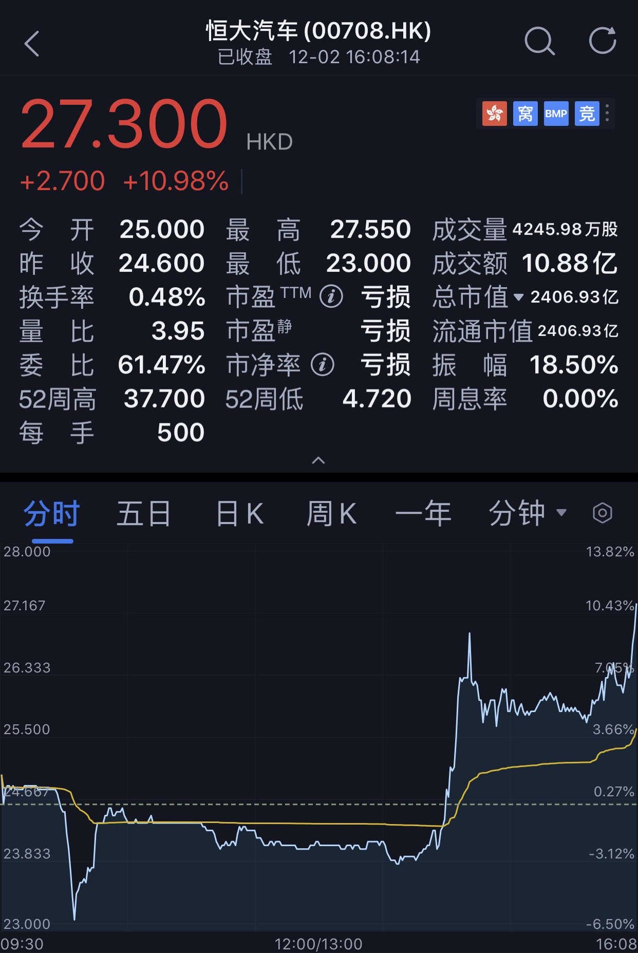 據港交所最新權益披露資料顯示,恒大汽車(0708.HK)於12月2日獲大股東中國恒大(3333.HK)增持2542.7萬股,合計6.6億港元。
