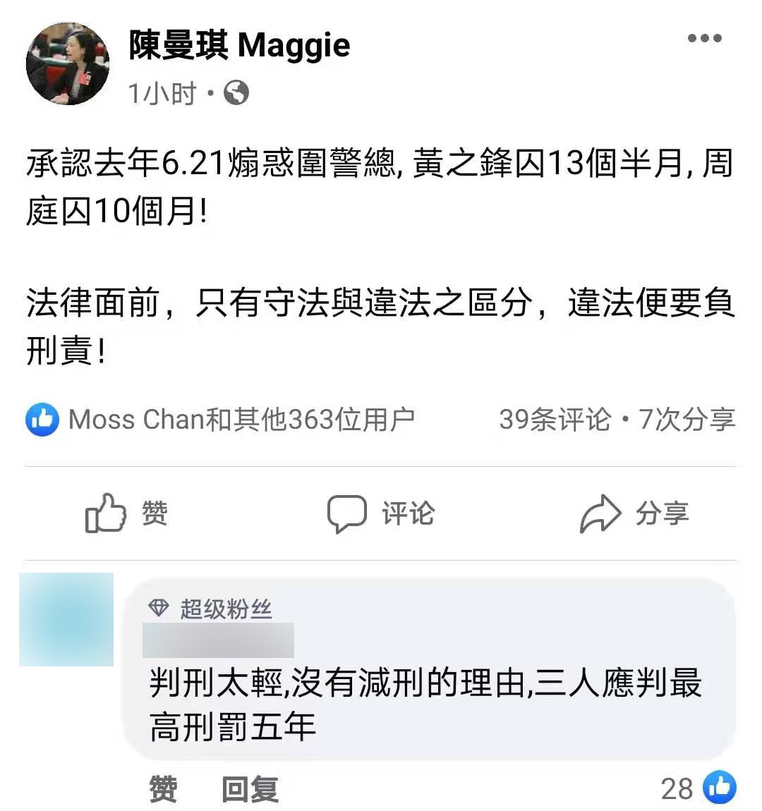 承認去年6月21日煽惑包圍警總,黃之鋒、周庭及林朗彥今日(2日)分別被判囚13.5月、10月和7月。港區全國人大代表陳曼琪今日在社交媒體發文指,法律面前,只有守法與違法之區分,違法便要負刑責!