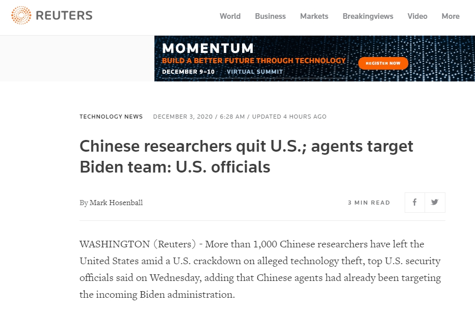 據路透社美東時間12月2日報道,美國司法部負責國家安全事務的助理部長約翰·德默斯2日聲稱,在美國所謂「打擊技術盜竊」的行動之下,已有1000多名中國研究人員離開美國,並補充說中國研究人員或針對即將上任的拜登政府。