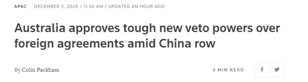 路透社表示,法案通過後,聯邦政府可以阻止澳大利亞各州、地方議會、機構等與外國政府達成一切協議,例如2018年維多利亞州與中國之間的「一帶一路」協議。