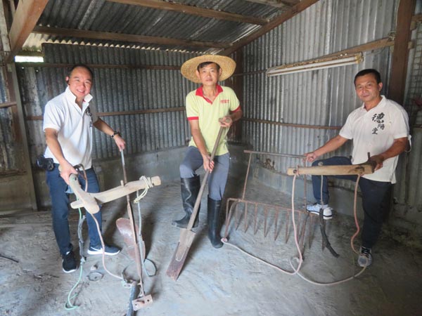 福利會成員(左起:陳耀安、列安邦、廖志協)致力保育村落,他們手中的昔日農耕用具(左起:犂、鍬、耙)會成為故事館的展品。記者 鄭玉君攝